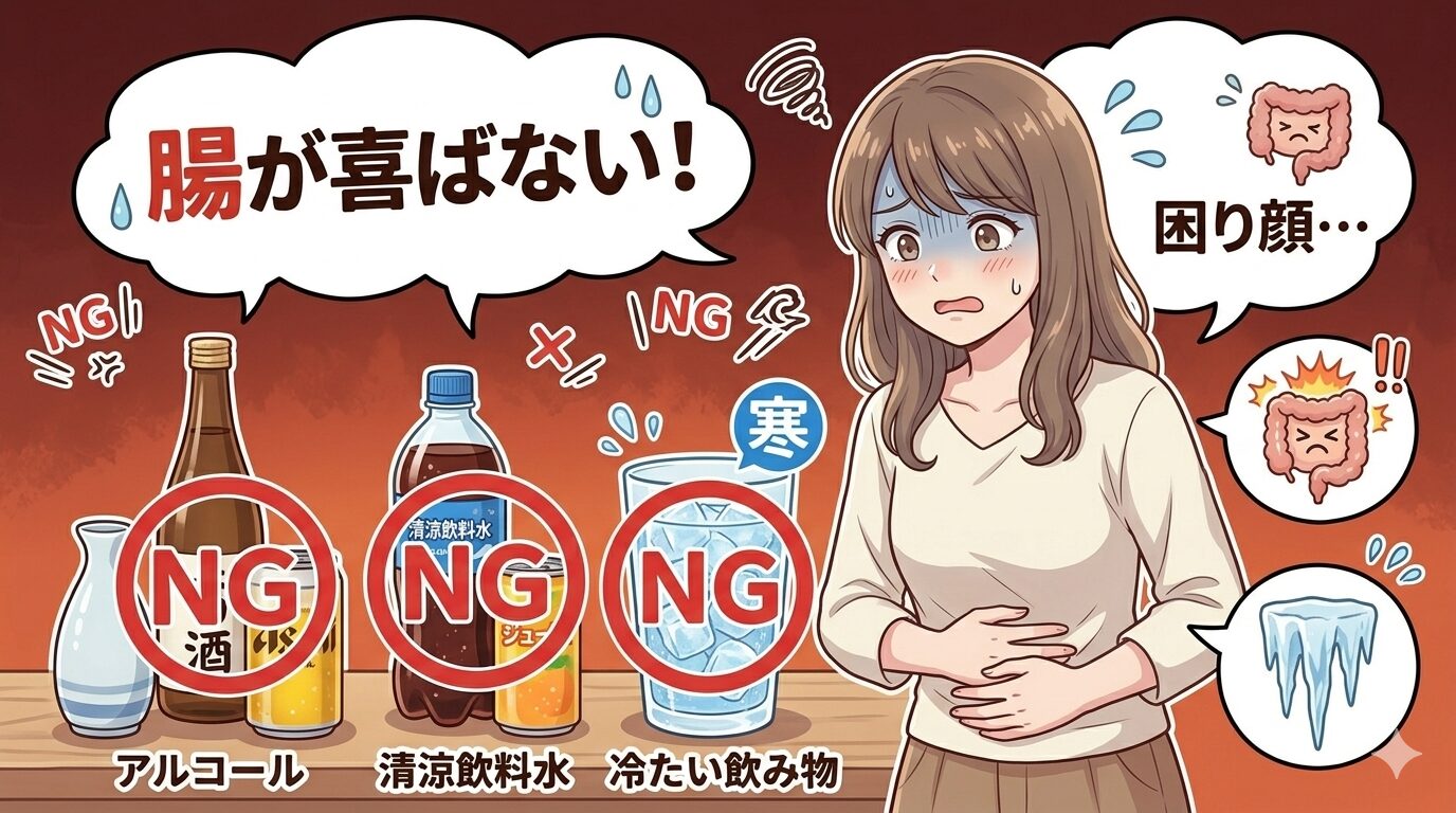 - 冷たい飲み物・アルコール・砂糖入り飲料は腸の邪魔をする