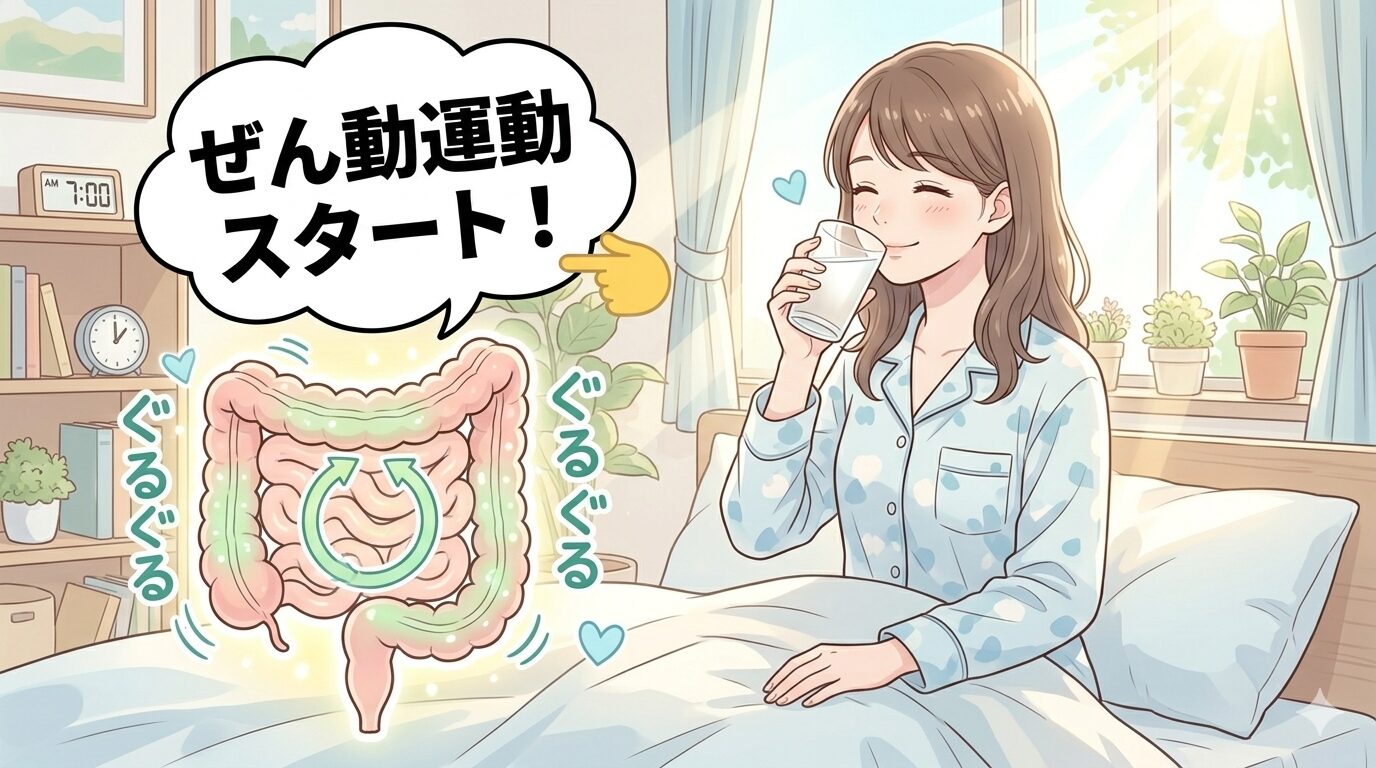 朝起きたばかりの腸は、8時間眠ったあとで動きが止まっている状態です。そこに飲み物が入ると、胃に刺激が伝わり、連動して腸のぜん動運動が起きやすくなります。これを「胃・結腸反射」と呼び、朝の排便リズムをつくるうえで大切なしくみです。